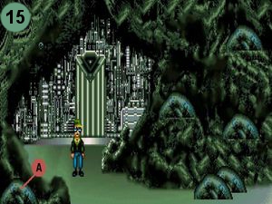 Vous atterrissez dans une grotte, sauvegardez. Eliminez le gardien de gauche ( image 15-A ) puis