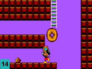 Eliminez la goutte de chocolat, avancez vers la droite sans glisser sur la pente. Eliminez les gouttes de chocolat qui sortent des douilles fixées au plafond (image 13) et descendez à l'échelle. Enlevez le muffin qui se trouve sur votre chemin et avancez sans vous arrêter pour ne pas être écrasé par le donuts géant, laissez-vous tombez sur la plate-forme du bas (image 14).