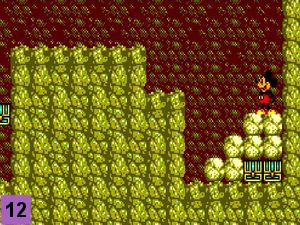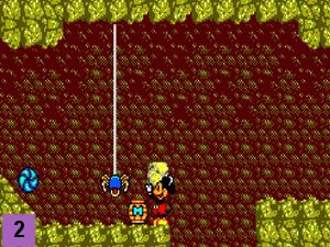 Descendez la 1ère échelle que vous croisez vers le début du niveau (point R sur la carte). Prenez le rocher (image 1) et allez à gauche. Mettez-vous sous l'araignée pour la faire descendre puis lancez-lui le rocher pour vous en débarrasser (image 2), vous pouvez aussi l'éliminer avec un saut rebond. Occupez-vous maintenant le tatou bleu avec un saut rebond et prenez le tonneau.