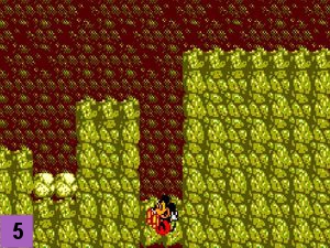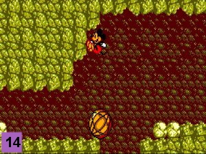 Prenez le rocher pour liberer le passage. Attendez le rocher et rebondissez-lui dessus pour l'esquiver (image 14). Continuez votre chemin en éliminant les deux tatous (le 1er avec une pierre) pour arriver au Point n°5.