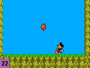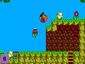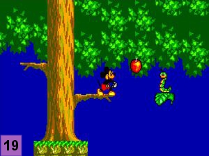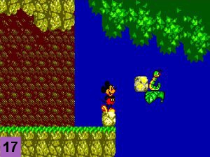 Sautez sur la feuille puis sur la branche de l'arbre en vous baissant de suite après pour esquiver le rongeur volant. Continuez d'avancer et prenez la pomme rouge (image 18). Continuez d'avancer en esquivant en chemin le rougeur volant pour arriver devant une 2ème chenille. Lancez la pomme sur la chenille et montez sur la feuille (image 19). Evoluez de feuille en feuille pour arriver sur la terre ferme, avancez de quelques pas pour arriver devant le boss.