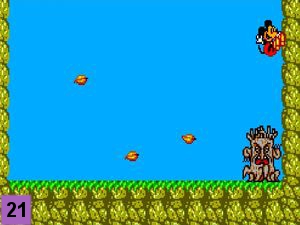Restez au centre de l'écran quand l'arbre se déplace de la gauche à la droite de l'écran en tournoyant et esquivez-le d'un saut quand il s'approche de vous (image 20). Touchez-le un saut rebond sur la tête quand il s'arrête avant qu'il n'envoie ses feuilles (image 21). Refaites cette technique 4 fois et prenez le joyaux rouge pour finir le niveau (image 22).