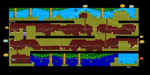 | Vous avez deux chemins possibles pour finir ce niveau. Pensez à ouvrir tout les coffres pour obtenir une vie supplémentaire tous les 10000pts. Les coffres invisibles sont entourés en bleu sur la carte du niveau. |