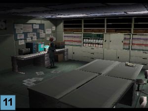 Retournez dans le Hall du Bureau de Gestion (A9). Désactivez la barrière laser qui se trouve vers le fond en esquivant le dino (si il est encore là). Faites un tour dans les toilettes (porte de droite A11) pour voir si il y a un item aléatoire. Retournez dans le hall (A9) et déverrouillez la porte d'à côté pour arriver dans la Salle des Stratégies (A12). Prenez le Disque E Code DDK (image 8-A), le releveur d'empreintes (image 8-B) et la cheville. Lisez le Fichier de réunion d'opérations pour obtenir des infos sur les cartes ID (image 8-C). Au fond de la pièce se trouve un coffre d'urgence jaune voir ICI.