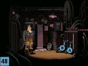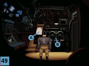 Après la scène, vous allez devoir saboter la bande. Abaissez ( la main ) le levier de droite (image 48-A) et