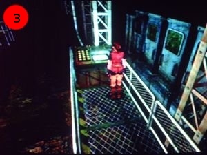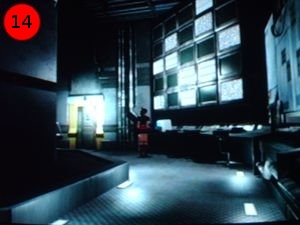 Longez la petite passerelle et passez la porte. Vous arrivez dans la salle des moniteurs de surveillance